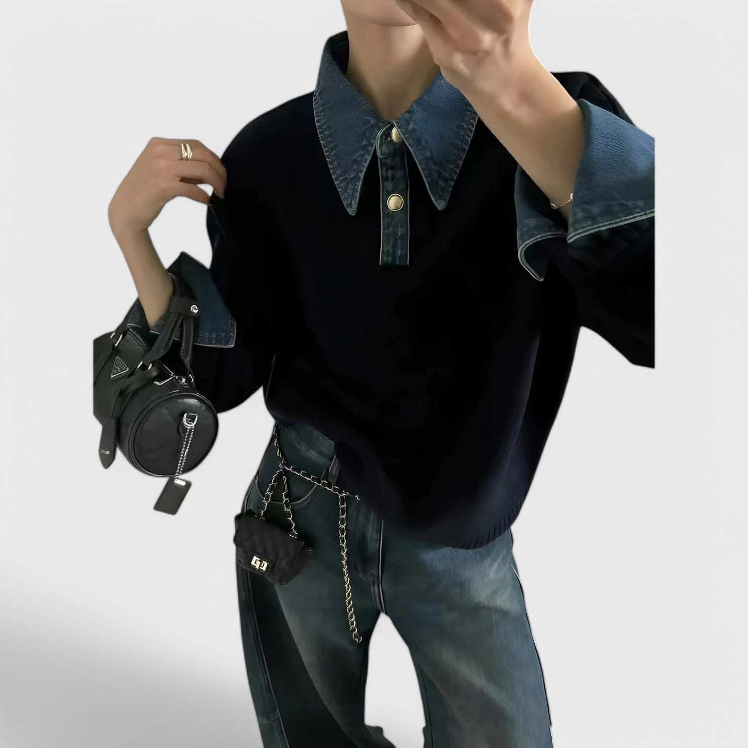 This knitted sweater features a contrast denim collar and cuffs, blending classic knitwear with distinctive detailing. It has a structured fit and a stylish finish. The mixed-material design adds visual interest, making it suitable for both casual and more polished outfits.